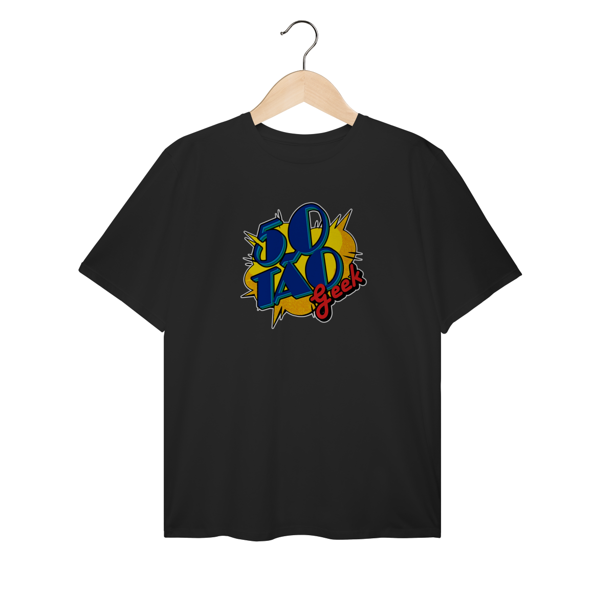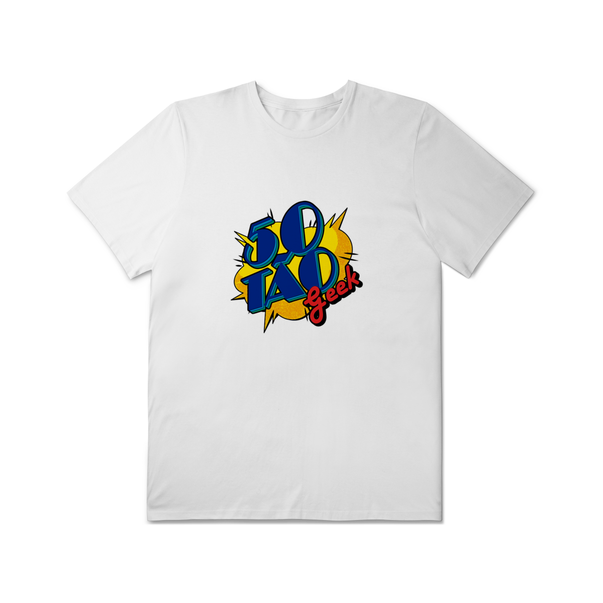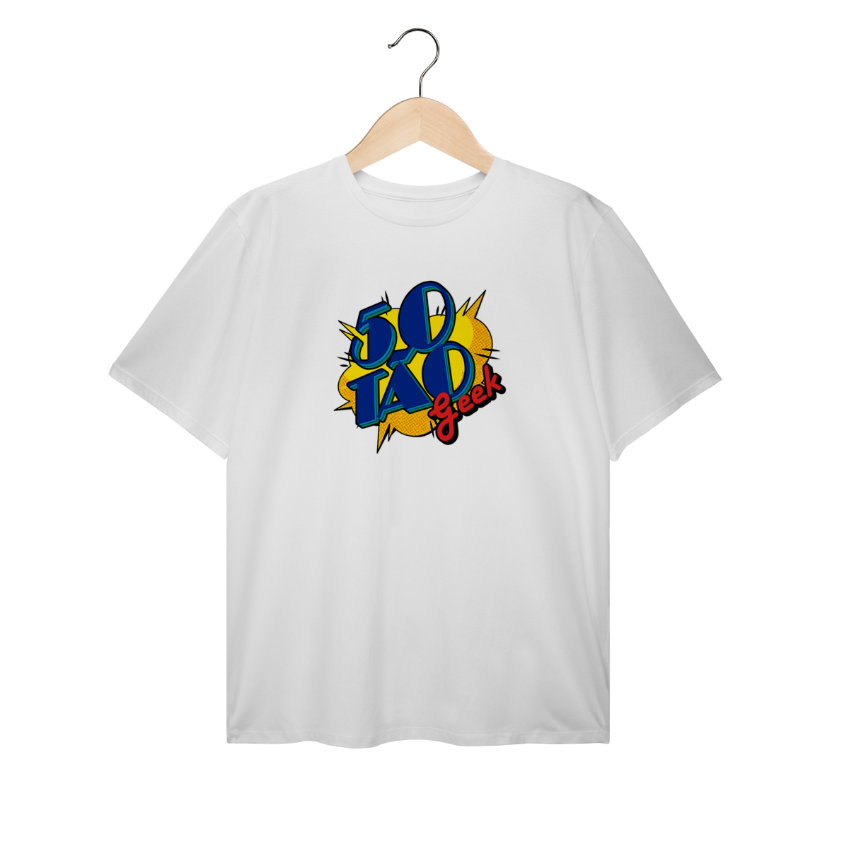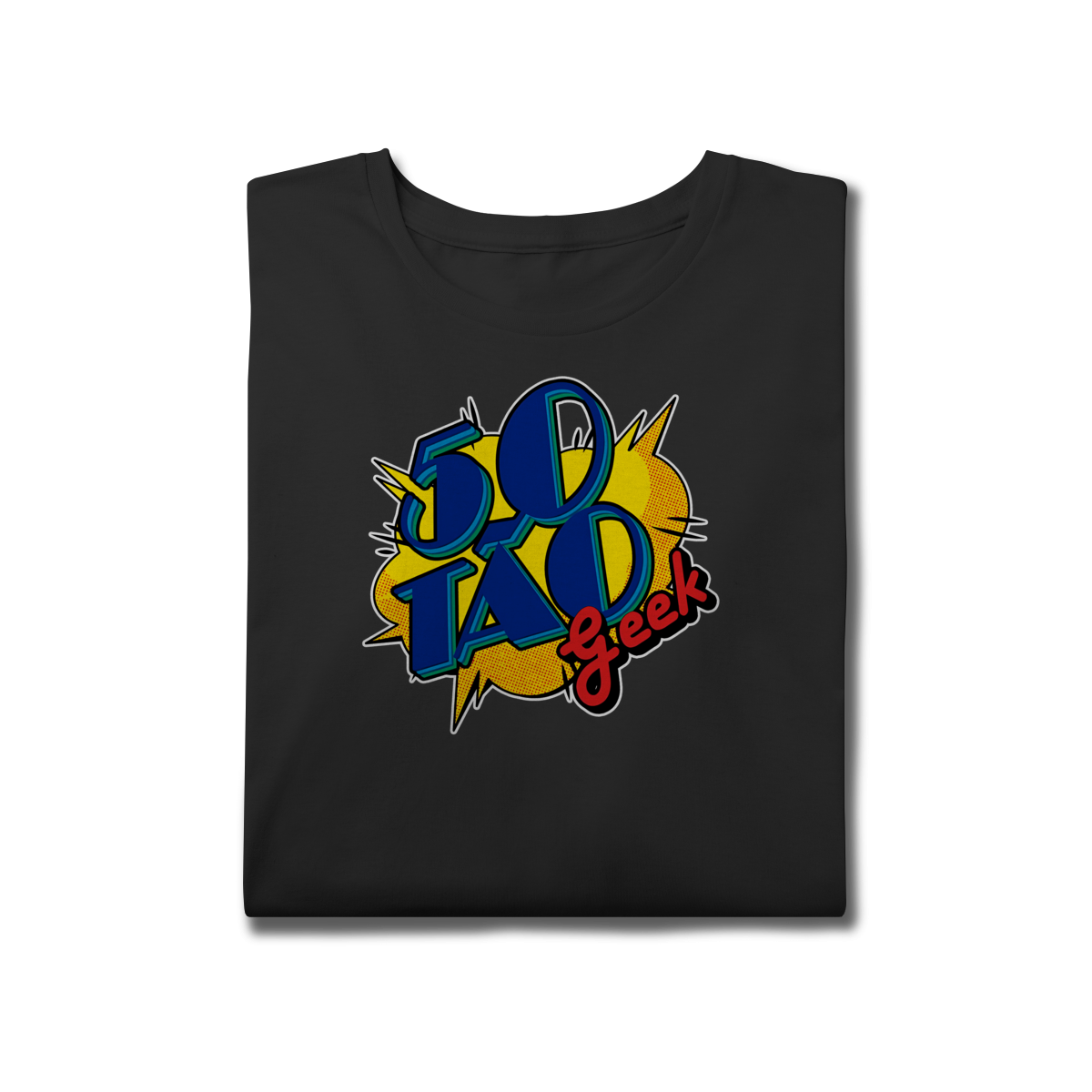A identidade visual que explode como um soco de uma HQ clássica. Este é o brasão oficial da nova "franquia" do 50Tão Geek. Com uma estética vibrante inspirada na Pop Art e nos quadrinhos da Era de Ouro, o design apresenta uma tipografia 3D dinâmica sobre um balão de fala explosivo, completo com texturas de retícula (halftone). É a estampa definitiva para quem vive a cultura nerd com intensidade, cor e, claro, sem papas na língua.