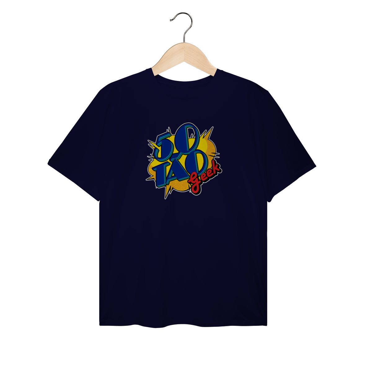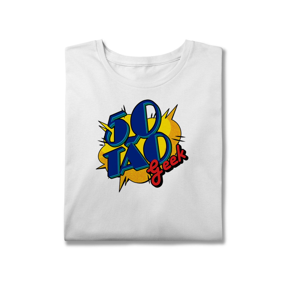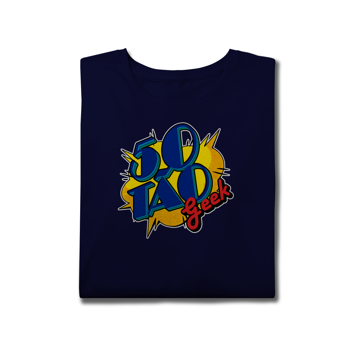 A identidade visual que explode como um soco de uma HQ clássica. Este é o brasão oficial da nova "franquia" do 50Tão Geek. Com uma estética vibrante inspirada na Pop Art e nos quadrinhos da Era de Ouro, o design apresenta uma tipografia 3D dinâmica sobre um balão de fala explosivo, completo com texturas de retícula (halftone). É a estampa definitiva para quem vive a cultura nerd com intensidade, cor e, claro, sem papas na língua.