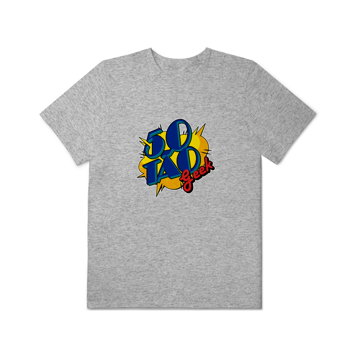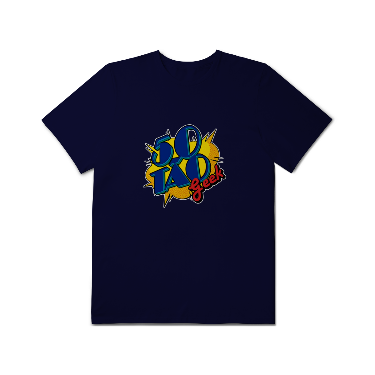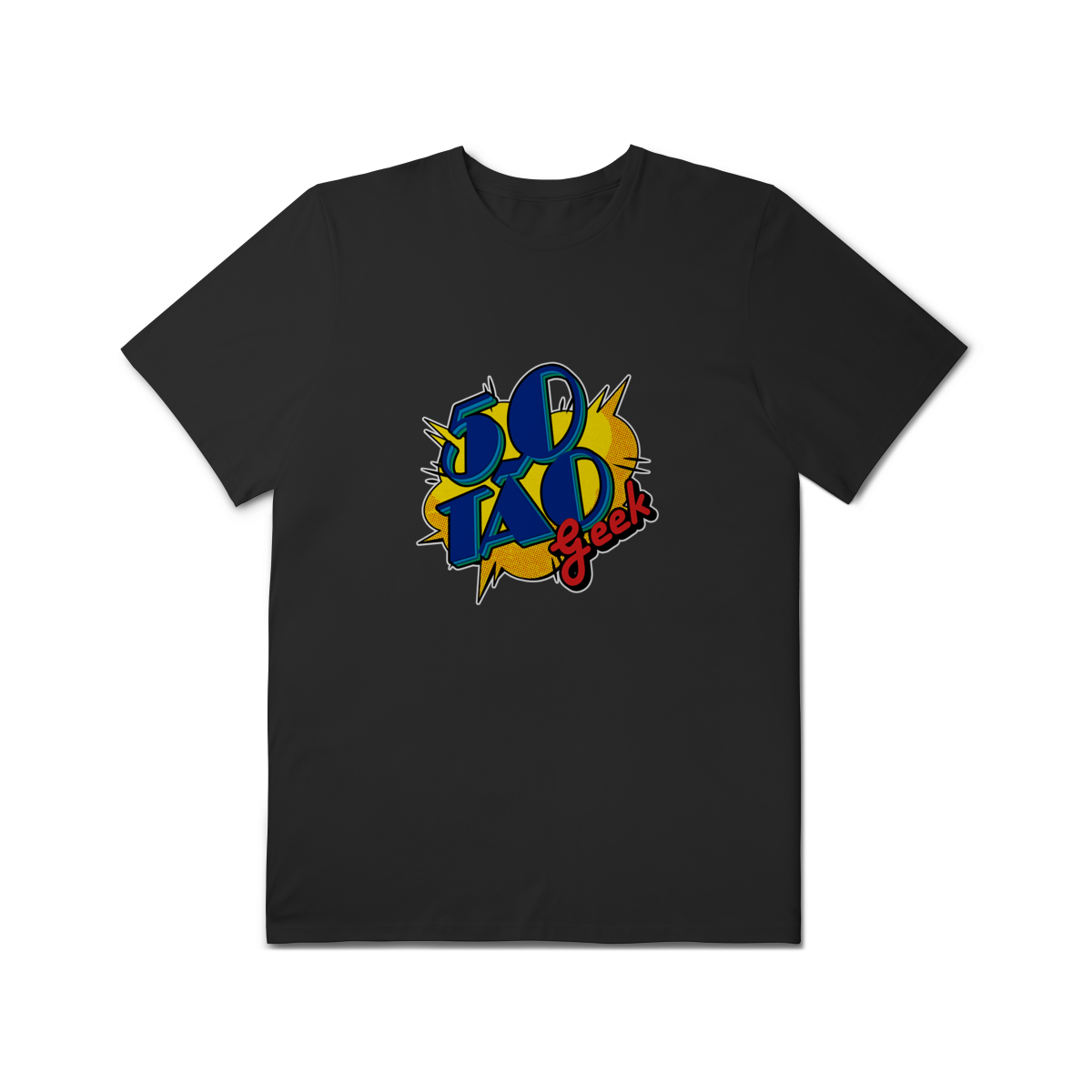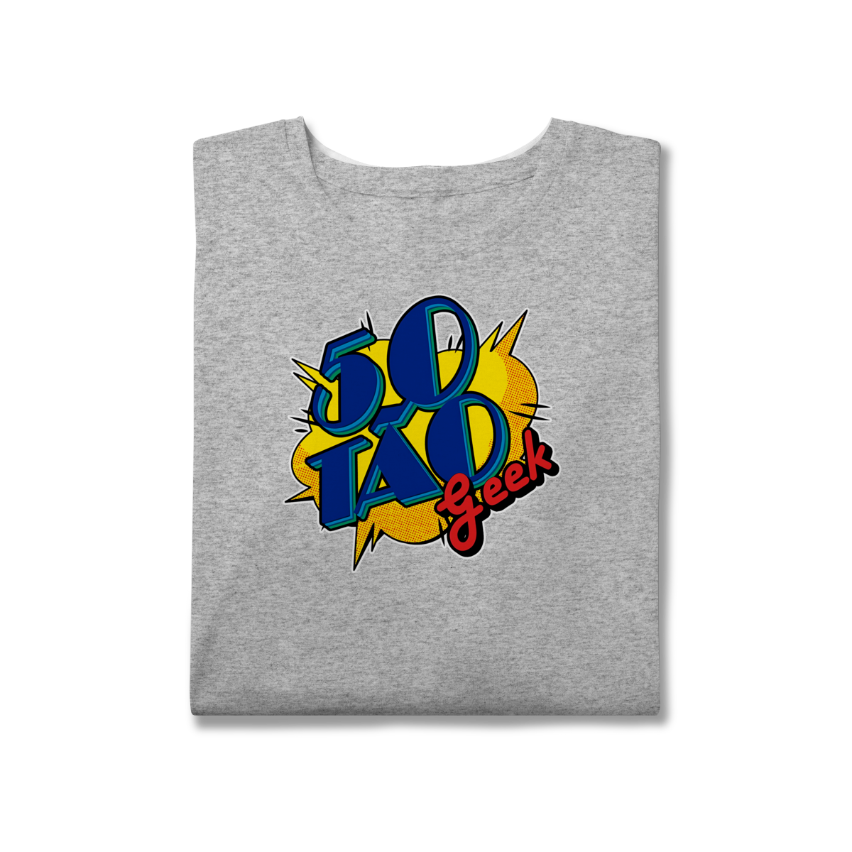 A identidade visual que explode como um soco de uma HQ clássica. Este é o brasão oficial da nova "franquia" do 50Tão Geek. Com uma estética vibrante inspirada na Pop Art e nos quadrinhos da Era de Ouro, o design apresenta uma tipografia 3D dinâmica sobre um balão de fala explosivo, completo com texturas de retícula (halftone). É a estampa definitiva para quem vive a cultura nerd com intensidade, cor e, claro, sem papas na língua.