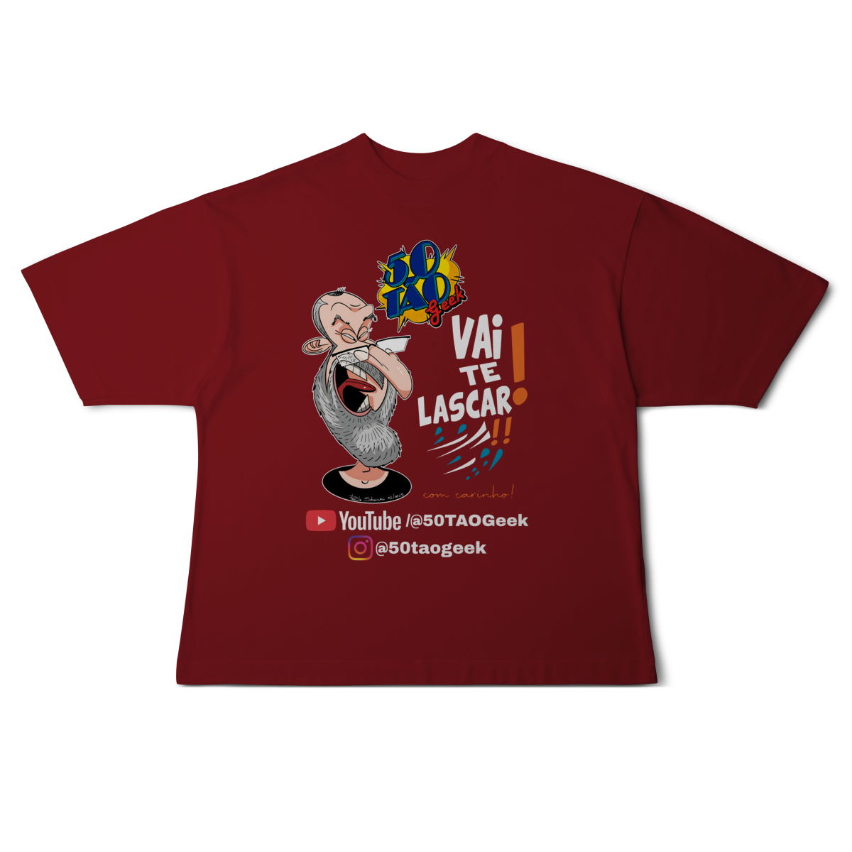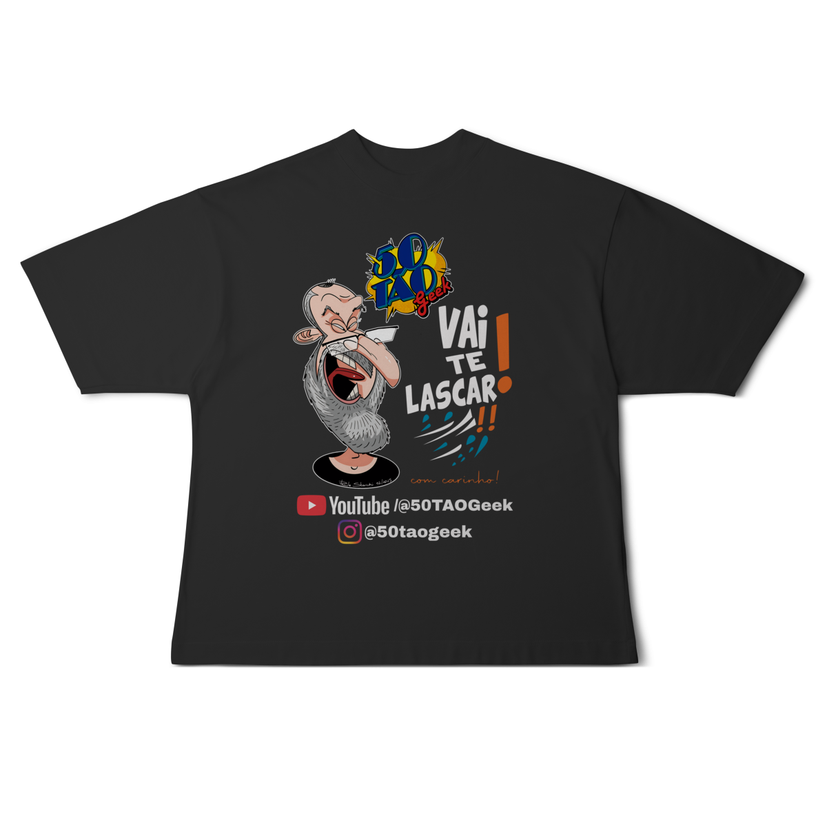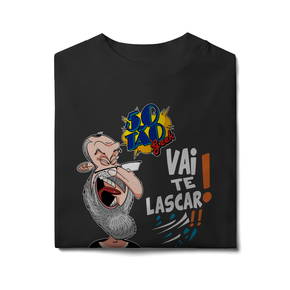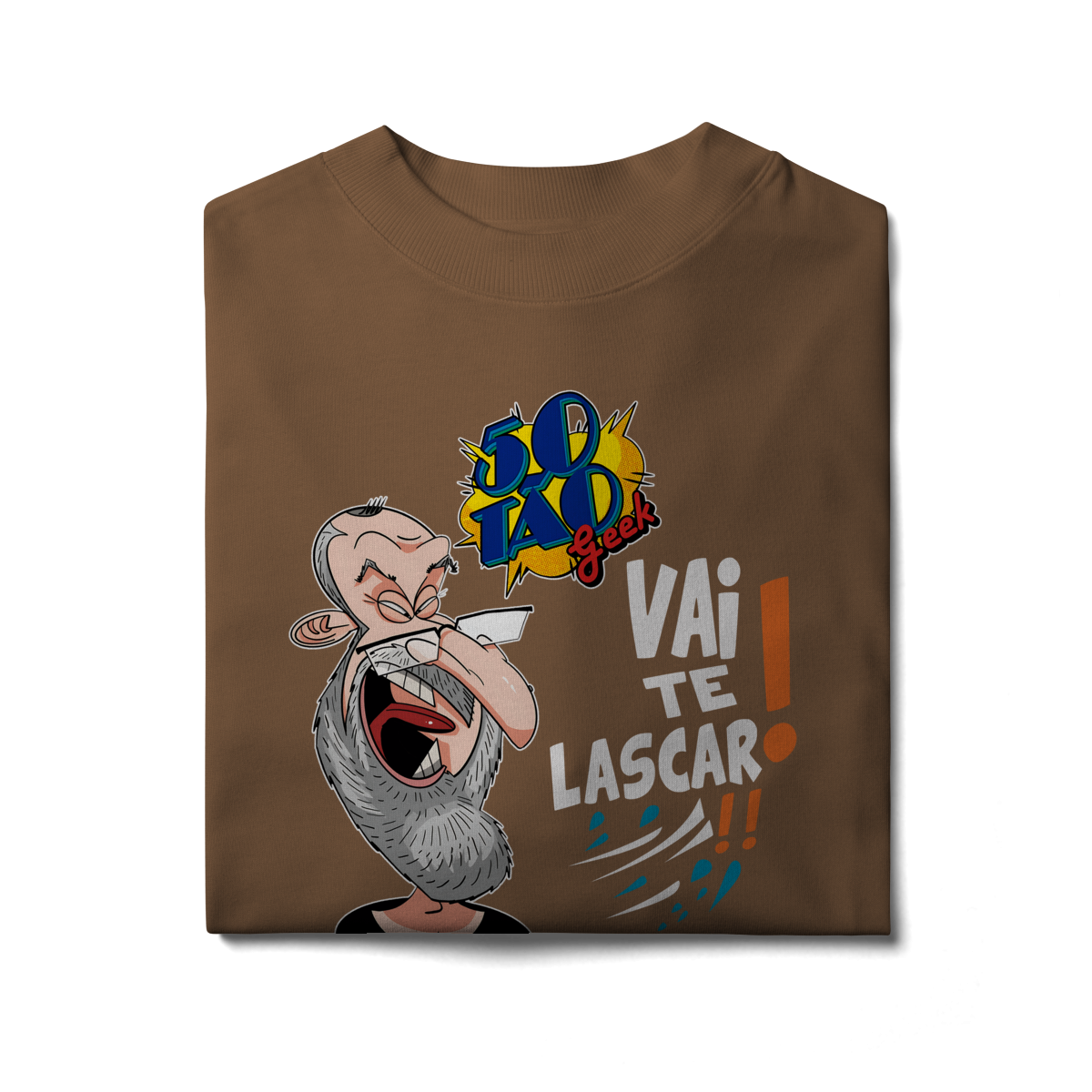 A verdadeira idade está na carteira de identidade; a alma é eternamente geek. Esta ilustração espetacular define o espírito do 50Tão Geek. Retratando a figura madura do criador, o design explode em cores e nostalgia dentro do próprio logotipo do canal em seu peito. Ícones lendários de heróis e vilões clássicos se misturam em uma colagem vibrante, simbolizando décadas de paixão pela cultura pop que agora transbordam em cada vídeo. É a estampa para quem sabe que a nerdolice não tem prazo de validade.