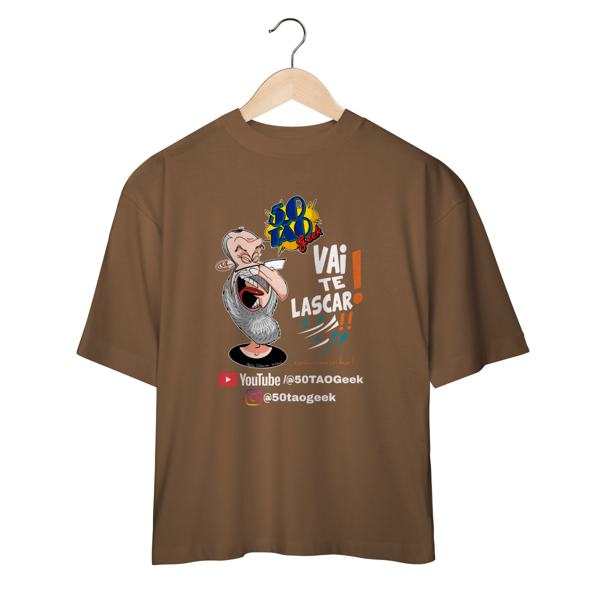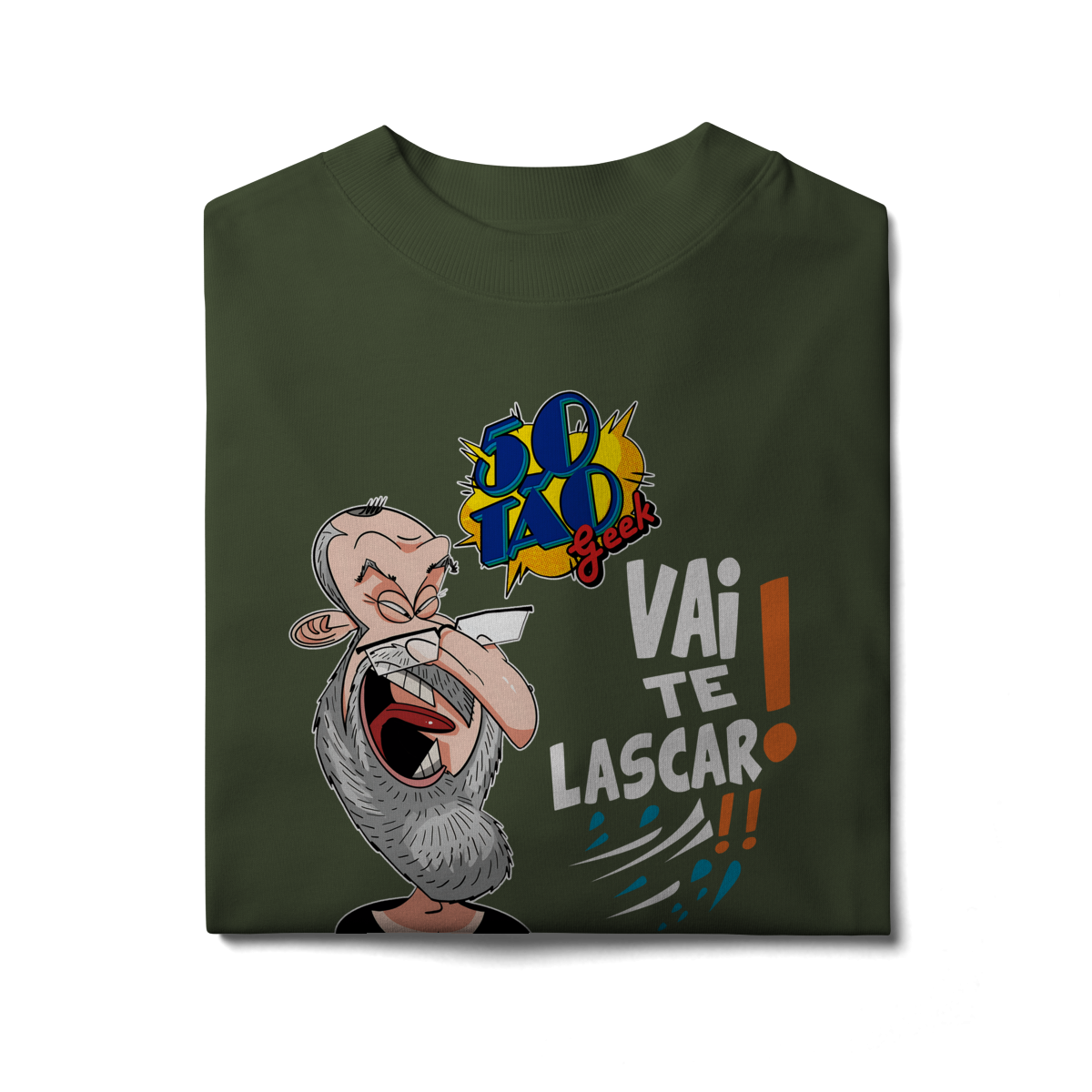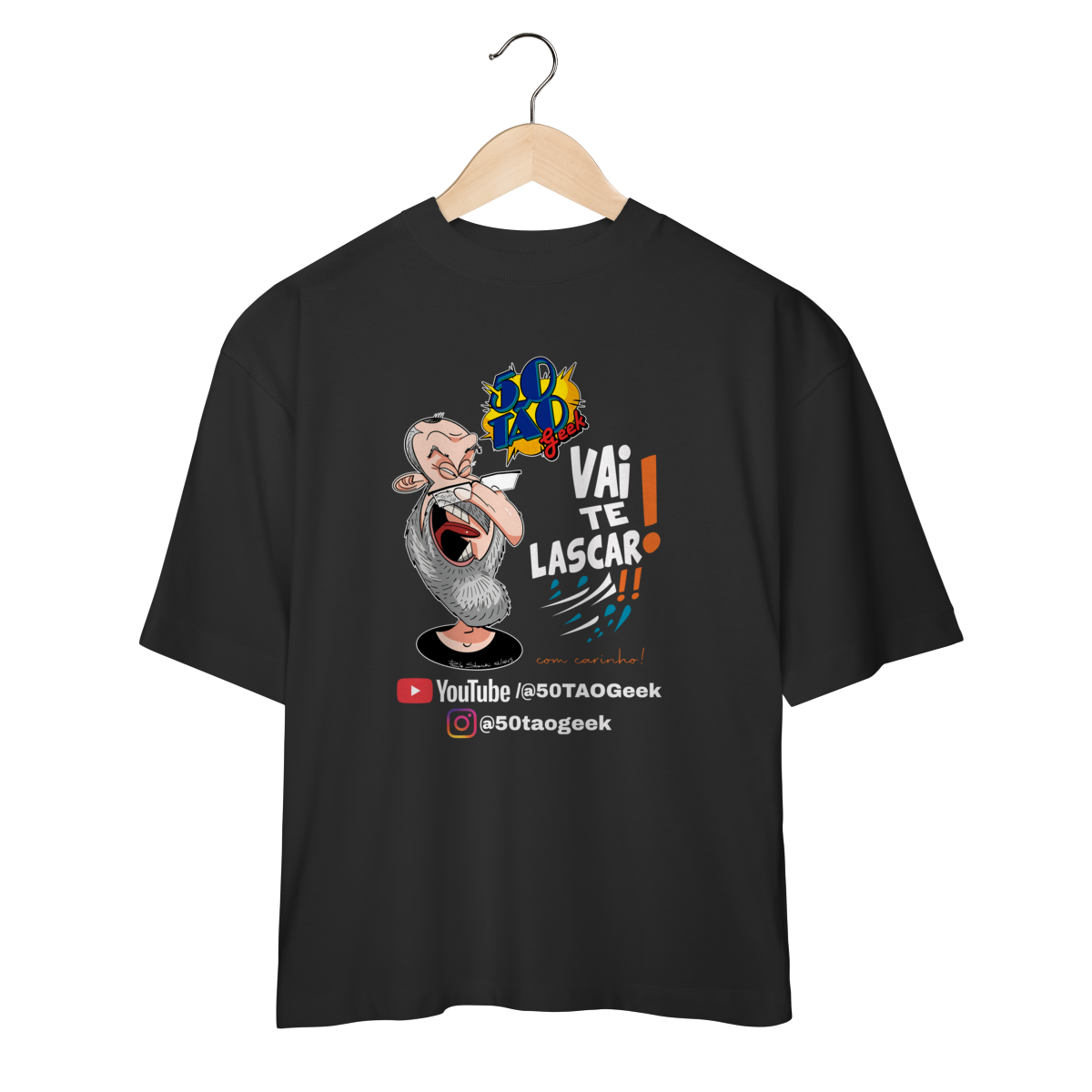 A verdadeira idade está na carteira de identidade; a alma é eternamente geek. Esta ilustração espetacular define o espírito do 50Tão Geek. Retratando a figura madura do criador, o design explode em cores e nostalgia dentro do próprio logotipo do canal em seu peito. Ícones lendários de heróis e vilões clássicos se misturam em uma colagem vibrante, simbolizando décadas de paixão pela cultura pop que agora transbordam em cada vídeo. É a estampa para quem sabe que a nerdolice não tem prazo de validade.