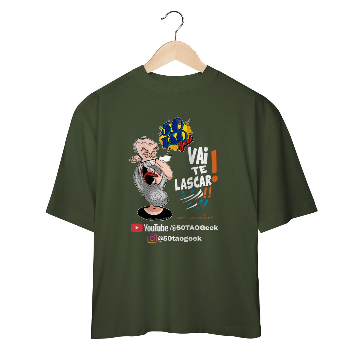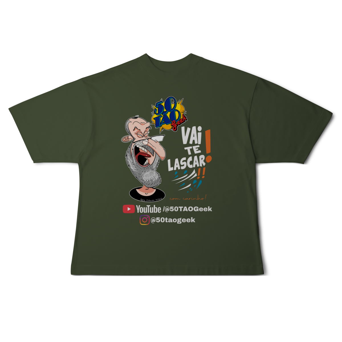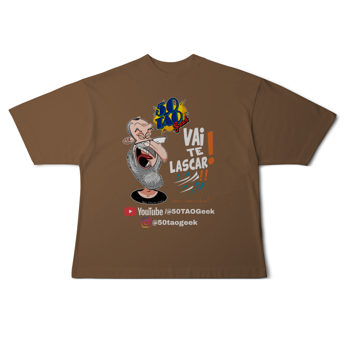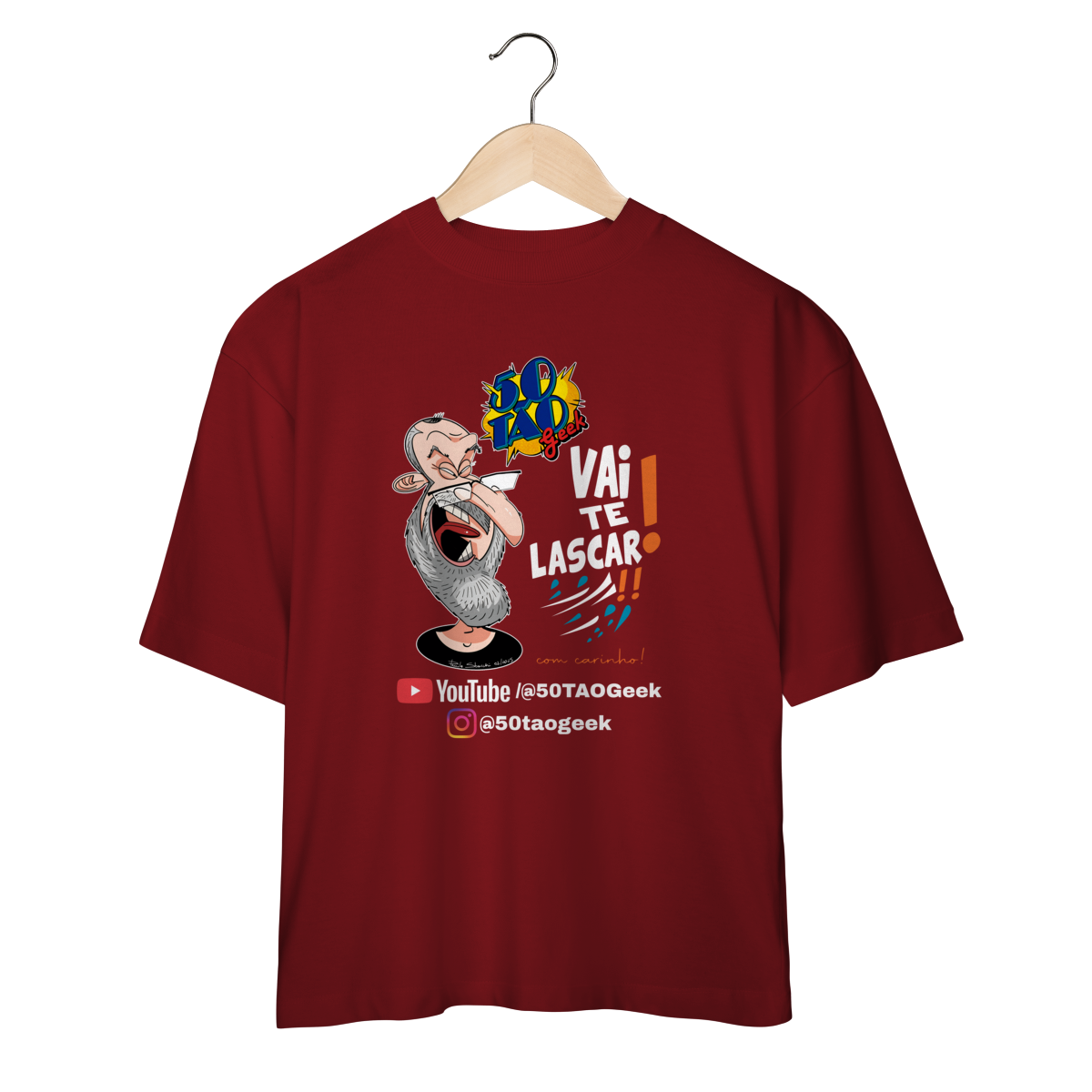 A verdadeira idade está na carteira de identidade; a alma é eternamente geek. Esta ilustração espetacular define o espírito do 50Tão Geek. Retratando a figura madura do criador, o design explode em cores e nostalgia dentro do próprio logotipo do canal em seu peito. Ícones lendários de heróis e vilões clássicos se misturam em uma colagem vibrante, simbolizando décadas de paixão pela cultura pop que agora transbordam em cada vídeo. É a estampa para quem sabe que a nerdolice não tem prazo de validade.