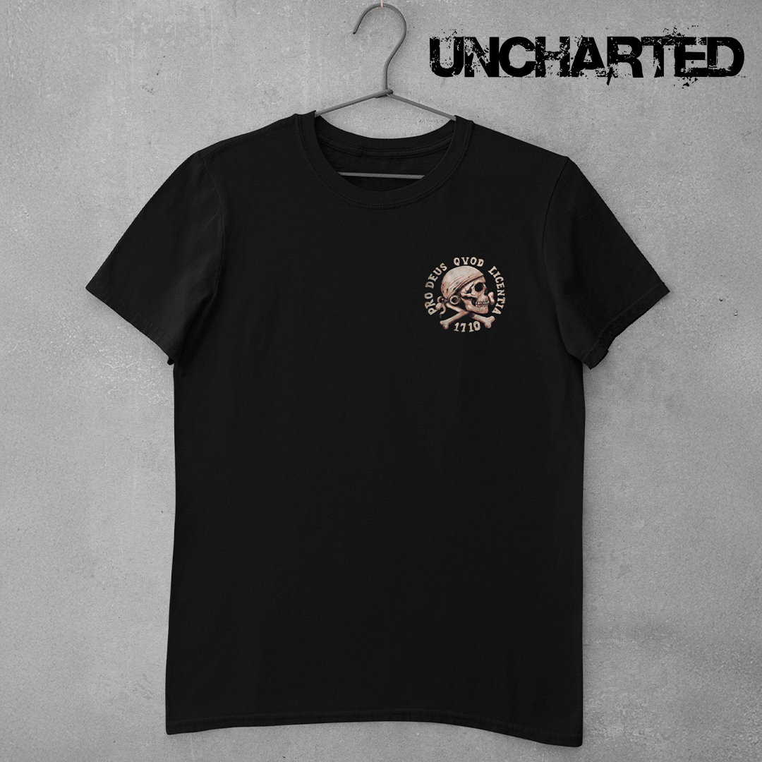 O crânio com bandana e ossos cruzados, cercado pela frase em latim “Pro Deus qvod Licentia”, é um símbolo de rebeldia e busca por tesouros, eternizado na saga de Nathan Drake.