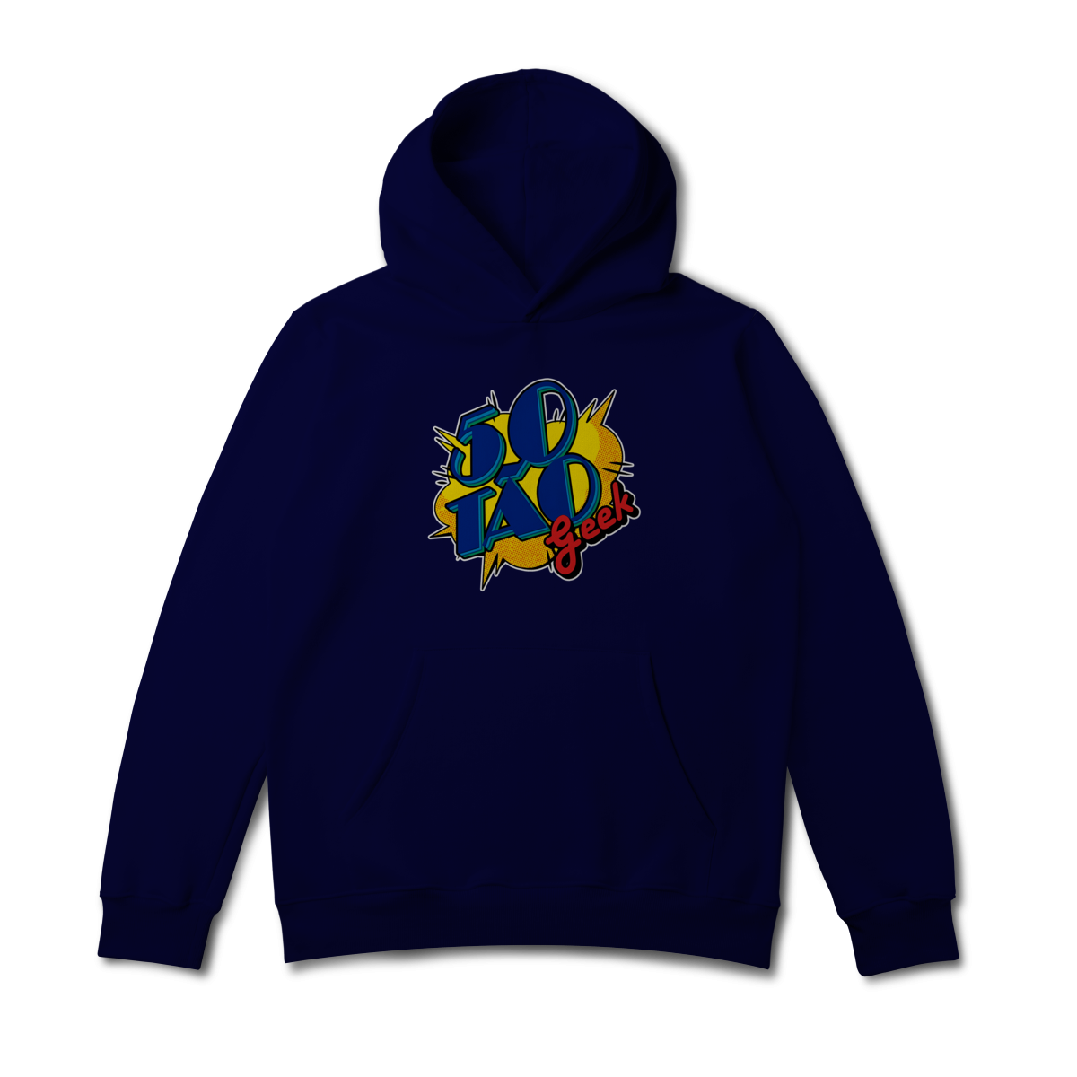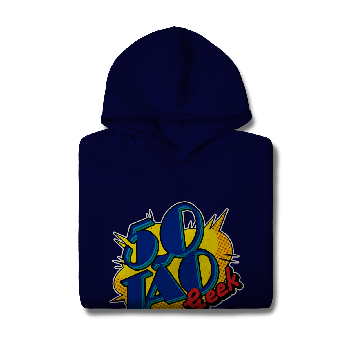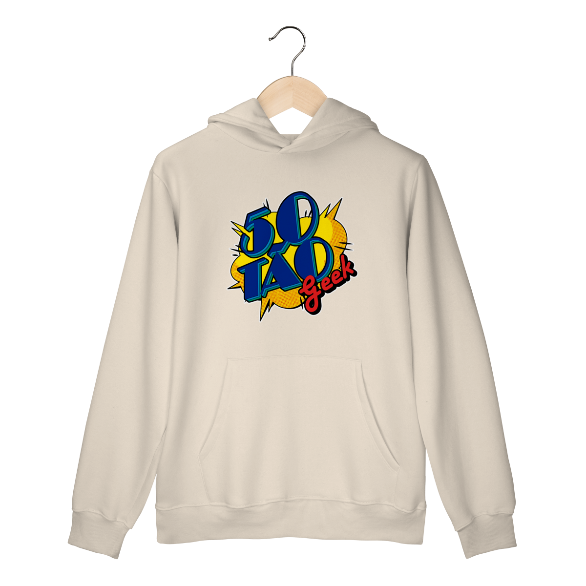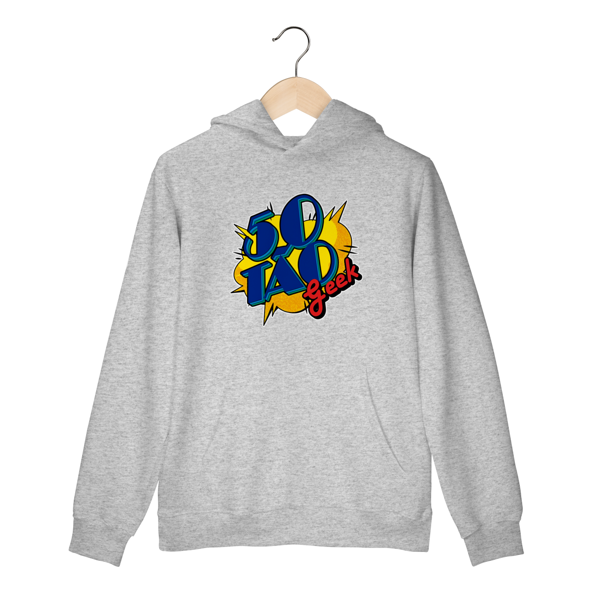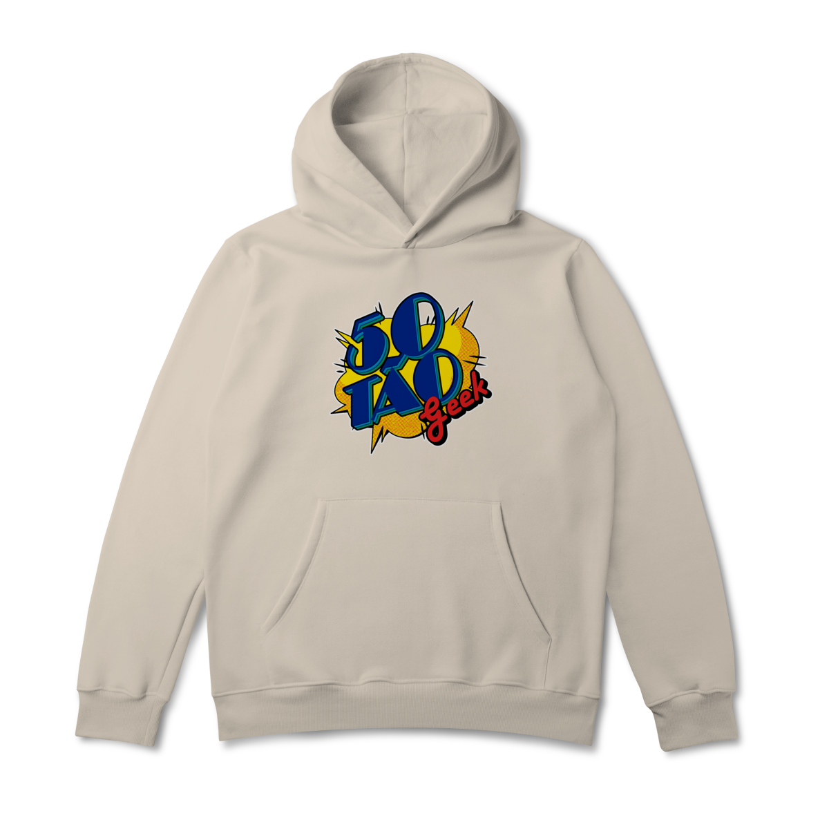 A identidade visual que explode como um soco de uma HQ clássica. Este é o brasão oficial da nova "franquia" do 50Tão Geek. Com uma estética vibrante inspirada na Pop Art e nos quadrinhos da Era de Ouro, o design apresenta uma tipografia 3D dinâmica sobre um balão de fala explosivo, completo com texturas de retícula (halftone). É a estampa definitiva para quem vive a cultura nerd com intensidade, cor e, claro, sem papas na língua.