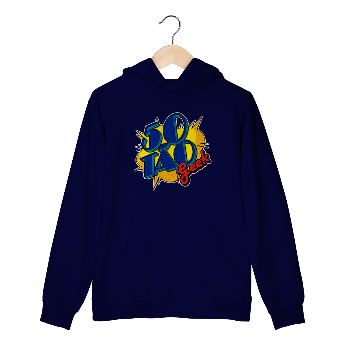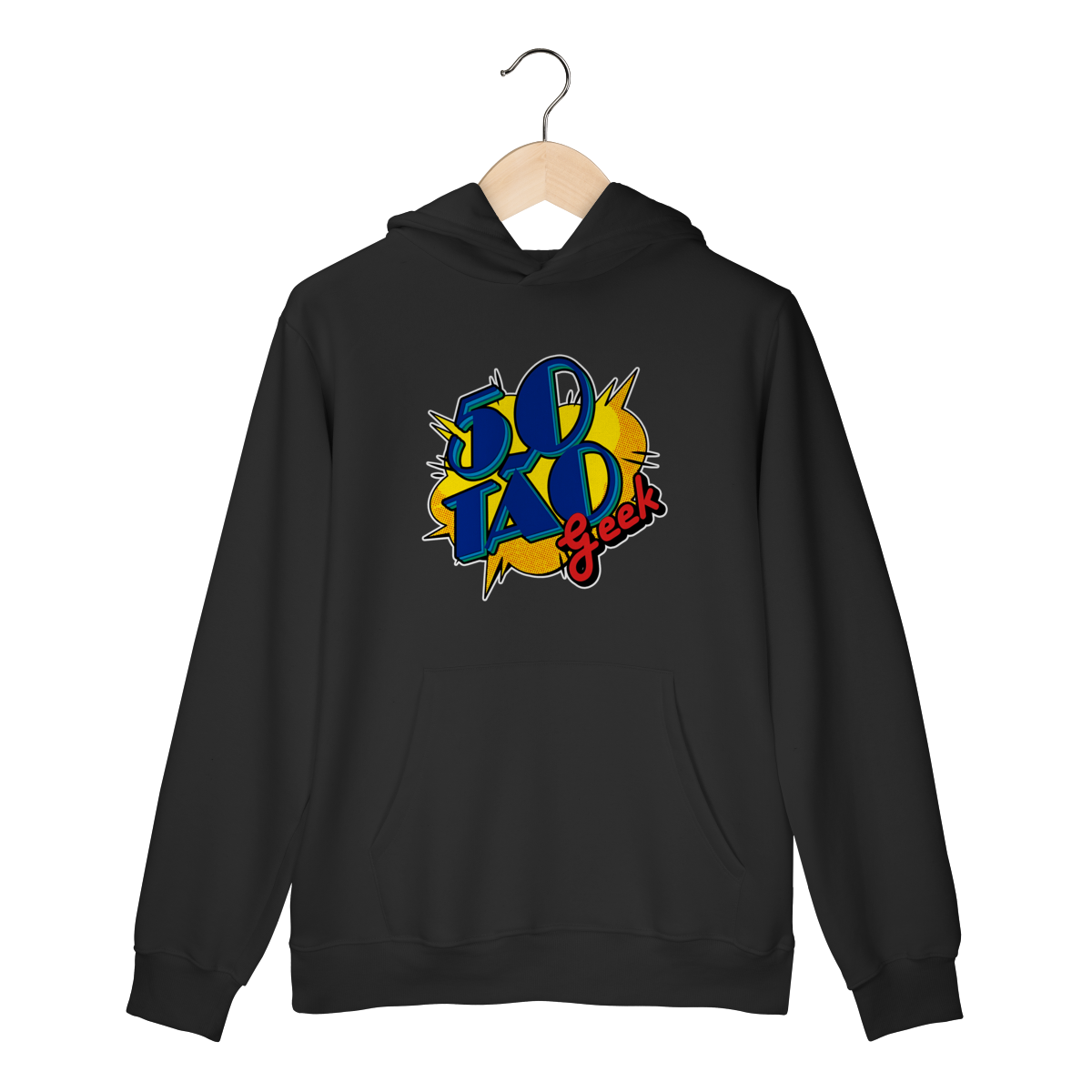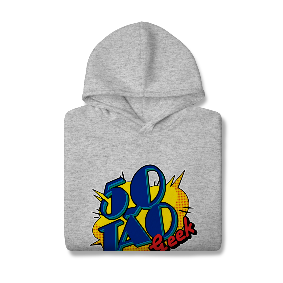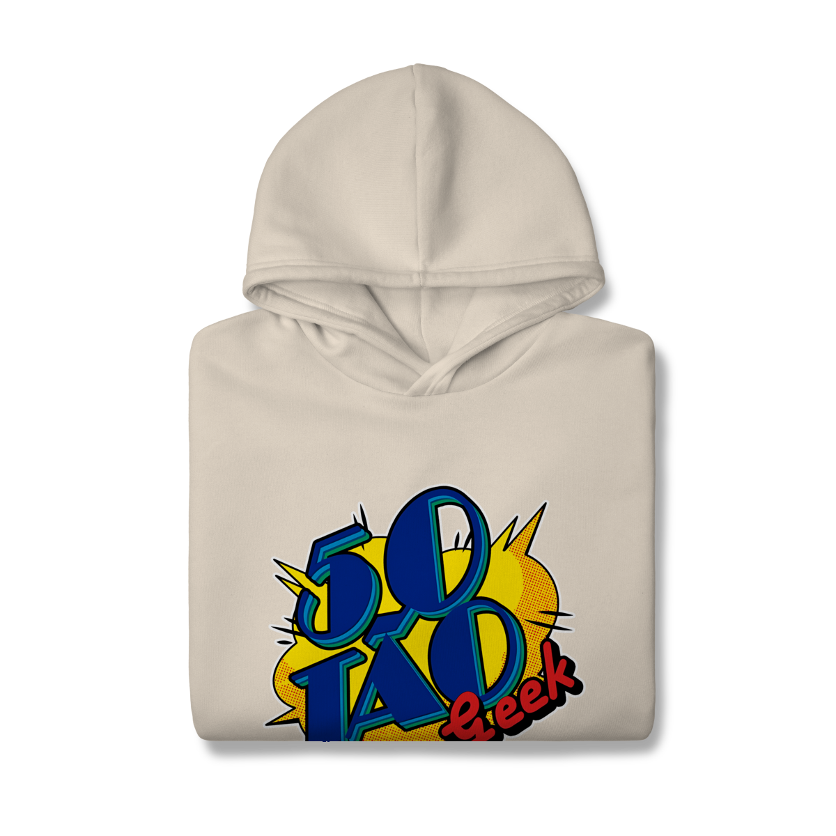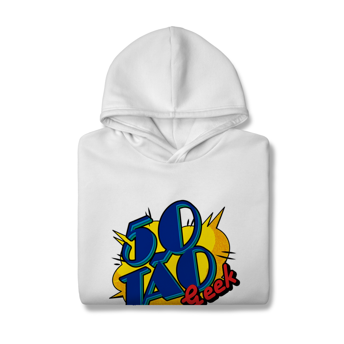A identidade visual que explode como um soco de uma HQ clássica. Este é o brasão oficial da nova "franquia" do 50Tão Geek. Com uma estética vibrante inspirada na Pop Art e nos quadrinhos da Era de Ouro, o design apresenta uma tipografia 3D dinâmica sobre um balão de fala explosivo, completo com texturas de retícula (halftone). É a estampa definitiva para quem vive a cultura nerd com intensidade, cor e, claro, sem papas na língua.
